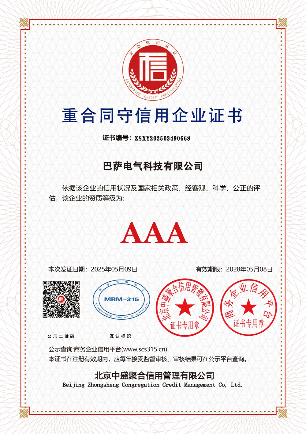重合同守信用企业证书